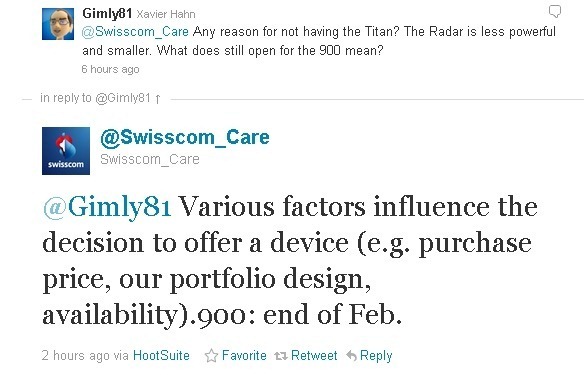 ทวีตที่ถามไประบุถึงเจ้า Nokia Lumia 900 ไปด้วย และทาง Twitter ของ Swisscom ก็ตอบกลับมาว่า Nokia Lumia 900 จะวางขายในช่วงปลายเดือนกุมภาพันธ์ของปี 2012