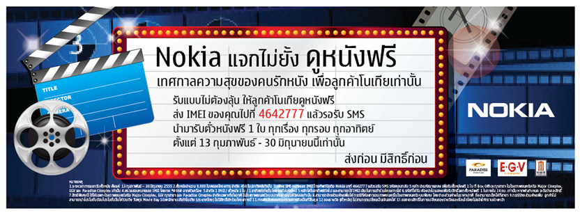 กรุงเทพฯ 1 กุมภาพันธ์ 2555 –โนเกียเอาใจลูกค้ารับเดือนแห่งความรัก ให้ดูหนังฟรีแบบไม่ต้องลุ้น เพียงส่งหมายเลข IMEI โทรศัพท์ Nokia ของคุณไปที่ 4642777 แล้วรอรับ SMS ตอบกลับเพื่อนำมารับบัตรชมภาพยนตร์ฟรี 1 ใบ ณ โรงภาพยนตร์ เมเจอร์ ซีนีเพล็กซ์ อีจีวี ทุกสาขา ทั่วประเทศ และพาราไดซ์ ซีนีเพล็กซ์ เฉพาะที่นั่งปกติ ทั้งในระบบปกติและดิจิตอล